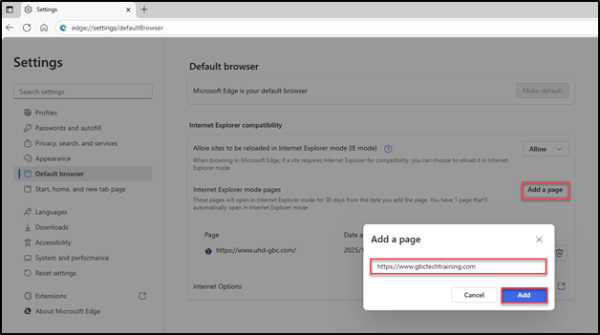 Click “Add a page” then enter the respective website with the format https:// preceding the website. For George Brown College Students enter https://www.gbctechtraining.com (please note that the URL must include www). For all other partner colleges or universities enter your respective site, for example, University of Houston students enter https://uhd-gbc.com (please note that the URL should not include www), MiraCosta College students enter https://miracosta-gbc.com, etc. Then click the “Add” button as shown below.